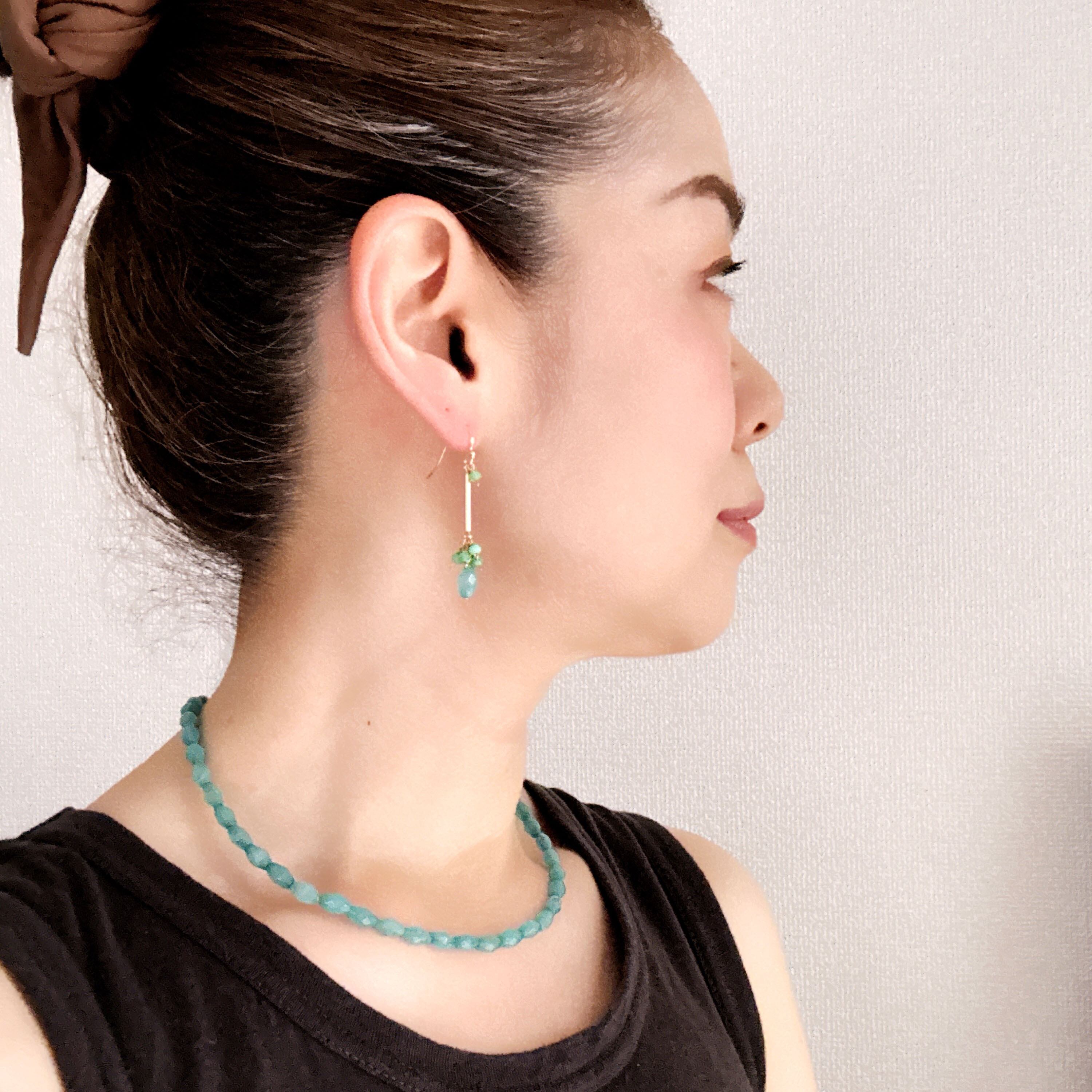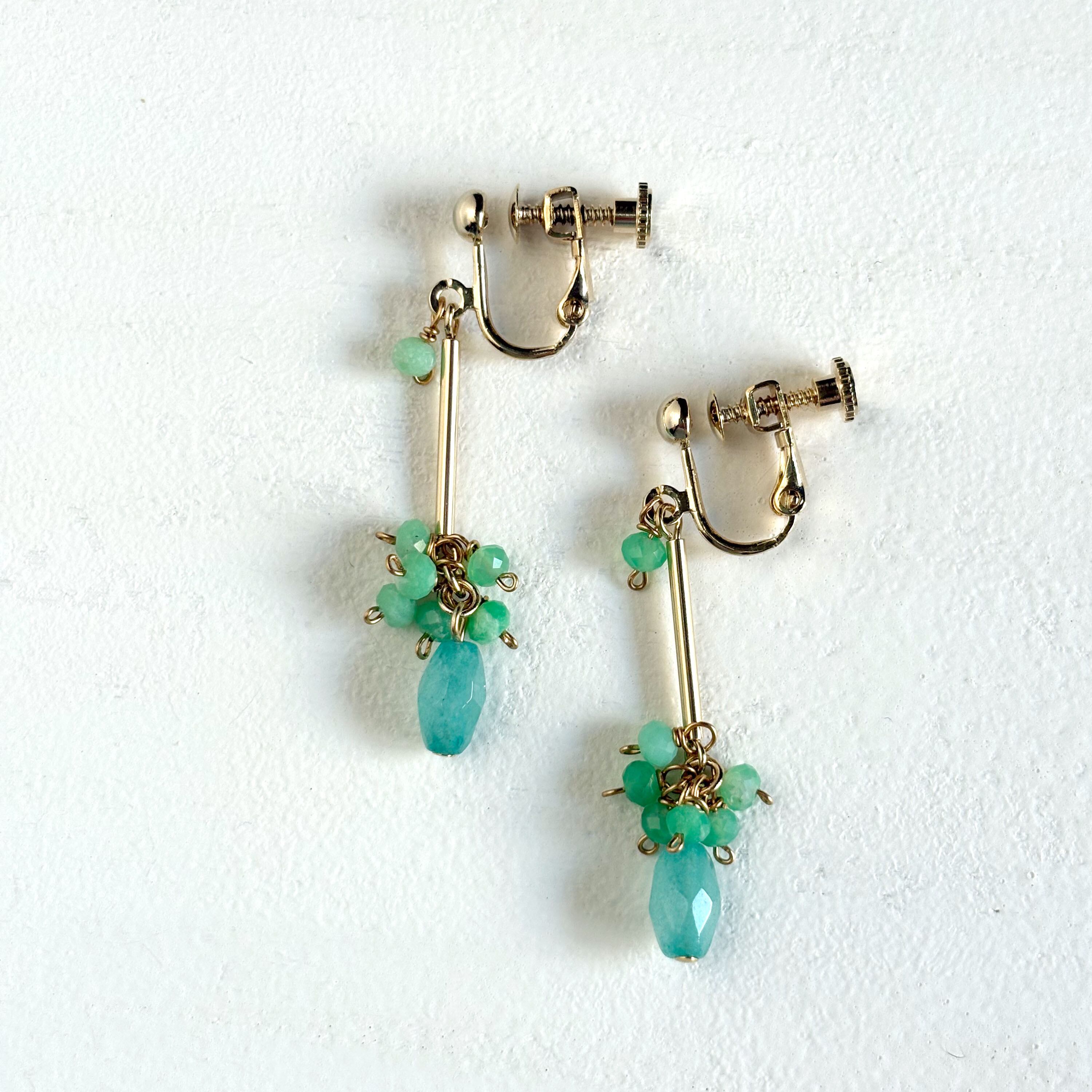 爽やかなブルーとグリーンの天然石が輝く、揺れるタイプのピアスとイヤリングです。