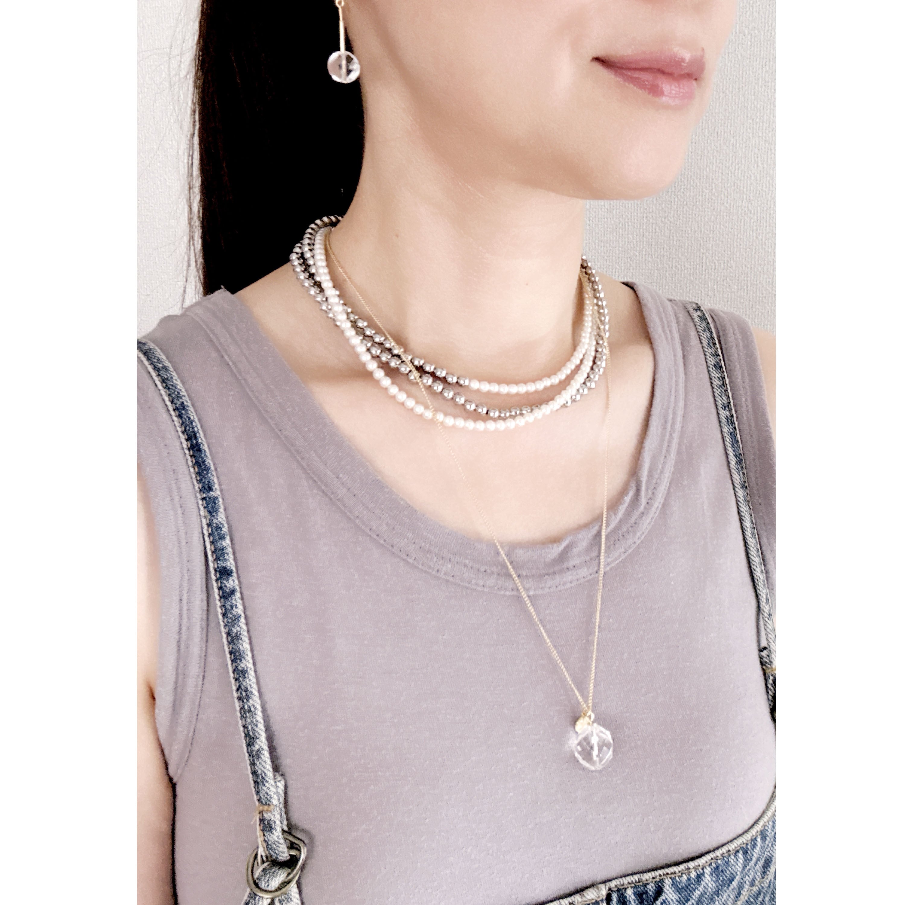 パールのネックレスは上品さがあるのが特徴ですが、シルバーを組み合わせる事で、カジュアルな雰囲気が加わり、コーディネートの幅が広がります。