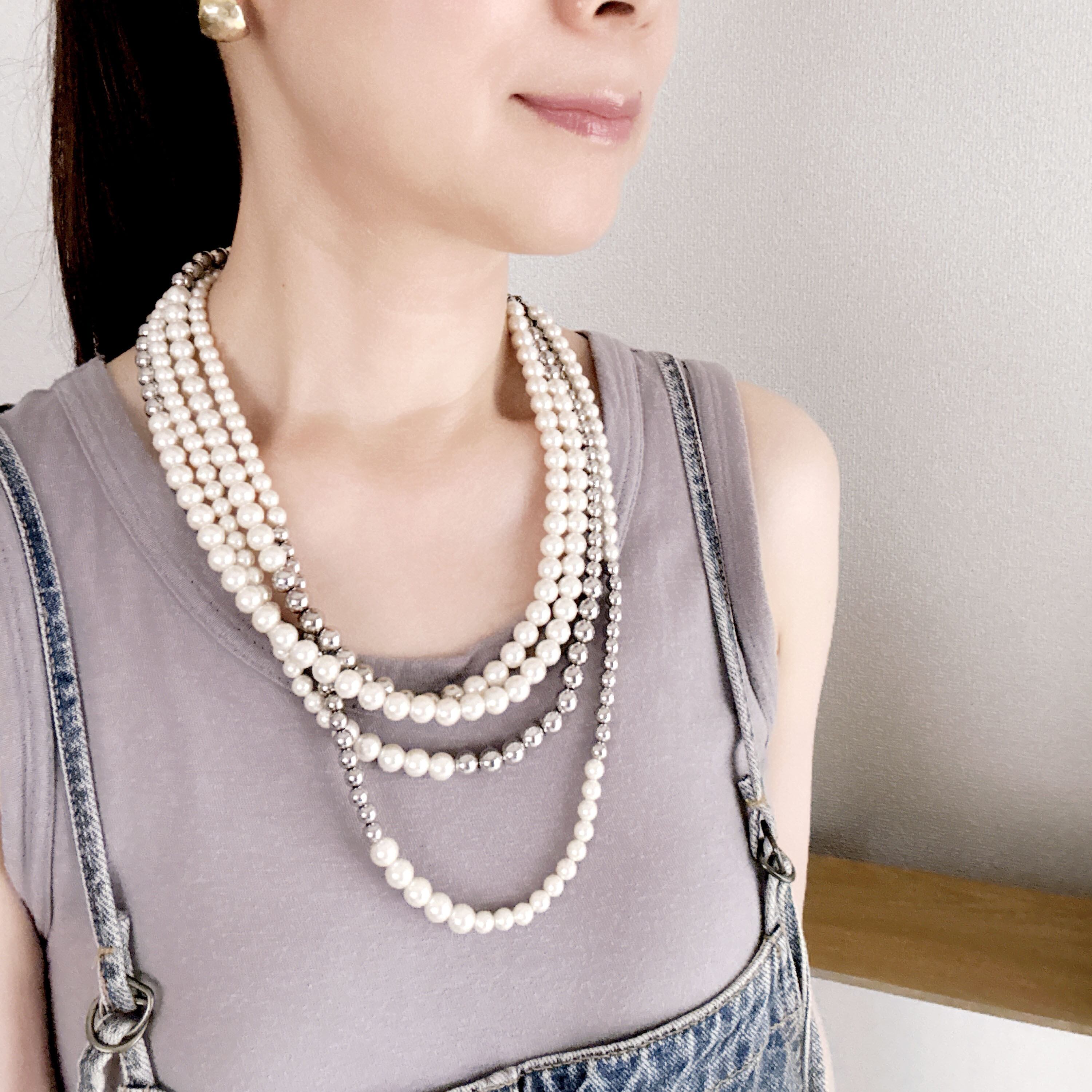 パールのネックレスは上品さがあるのが特徴ですが、シルバーを組み合わせる事で、カジュアルな雰囲気が加わり、コーディネートの幅が広がります。