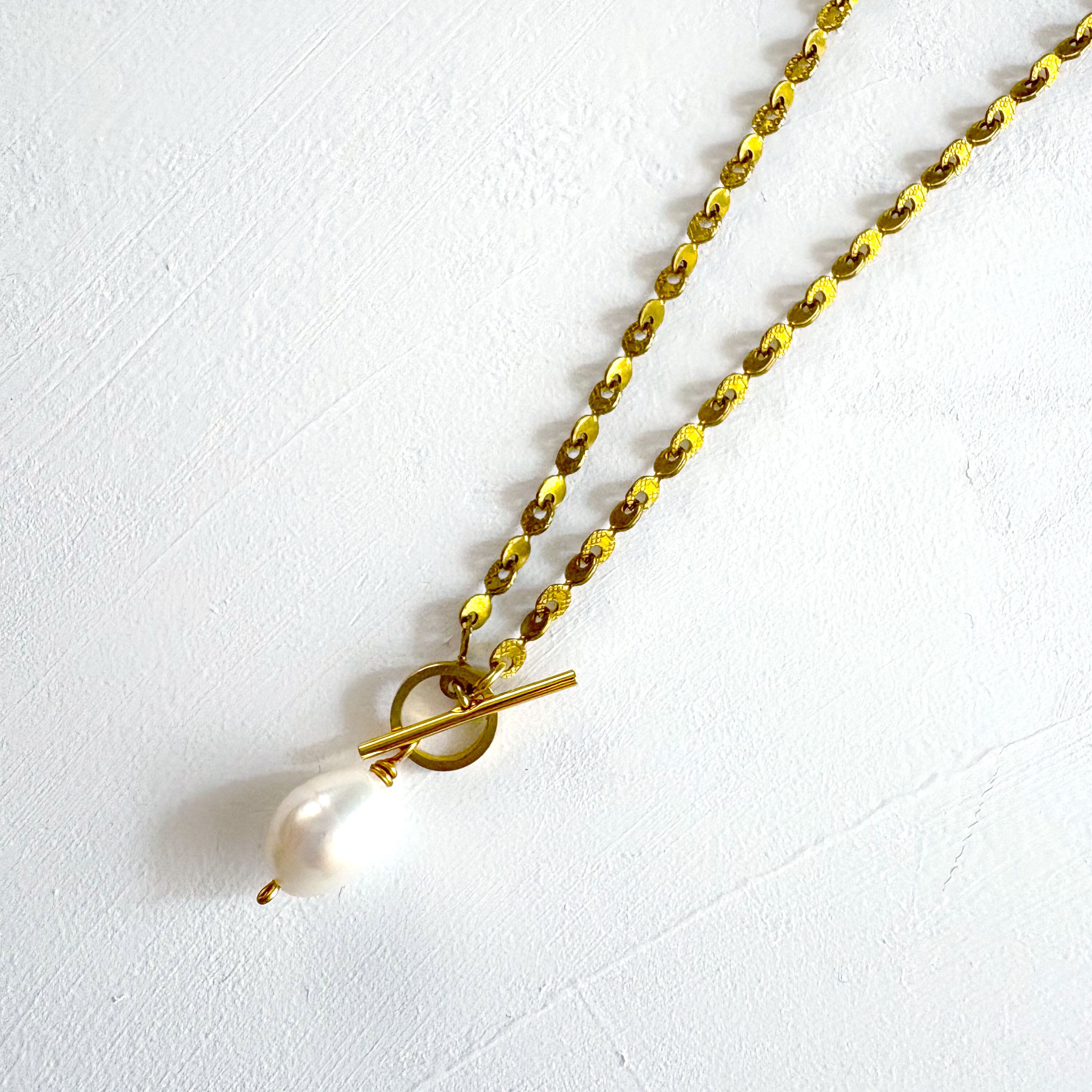 特徴的なチェーンをお楽しみいただけるチェーンネックレスに、小さなドロップ型の淡水パールを付けました。